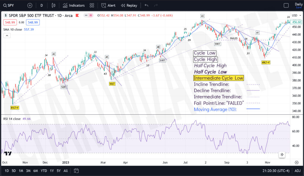 SPY DNA Oct 2022 -> Dec 2023 .. Sped up ~4x .. Cycle 1 '70RT' should read '49RT' , Cycle 3 '72RT' should read '52RT'. Accidentally put calendar days for those 2 labels rather than trading days.